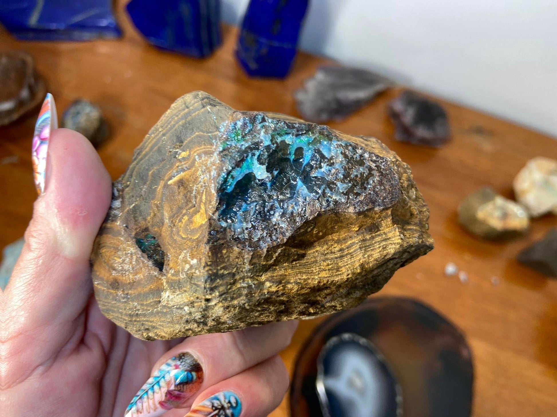 Yowah Opal – I am the storyteller of the Earth, my intricate patterns and flashes of color like ancient script carved in stone. I awaken wisdom, remind you of the layers of time, and connect you to the primal memory of the land.
