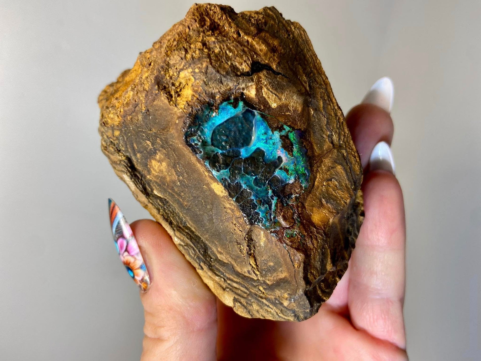 I am Boulder Opal — grounded, strengthened, made more durable by the ironstone that carries me. I am the embodiment of resilience, beauty emerging from stone, color blossoming from earth. I am here not just to dazzle, but to steady you.