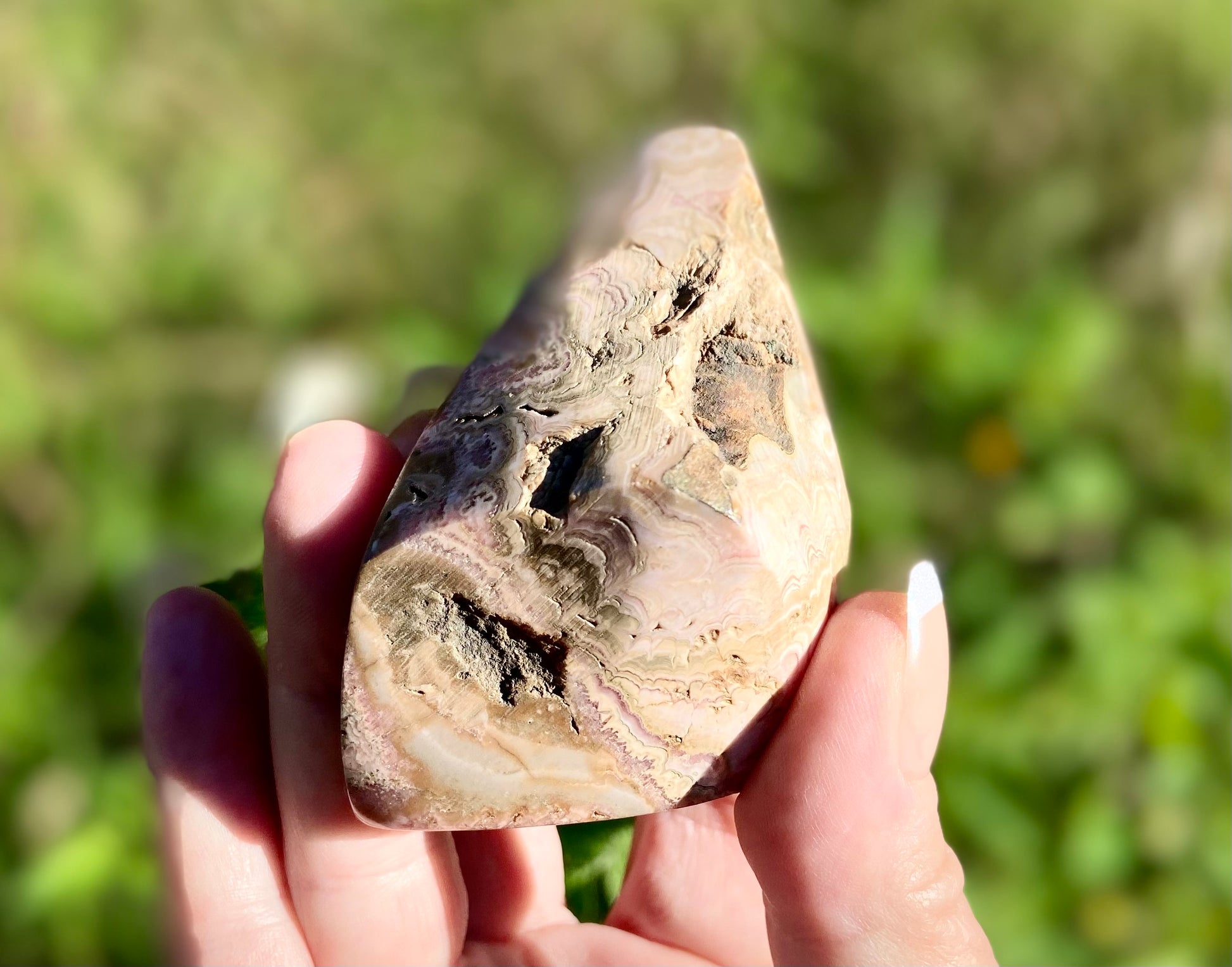 This stunning, high-grade Rhodochrosite freeform is a true collector’s gem, hand-selected from the legendary Capillitas mining district in Catamarca, Argentina. Polished on both sides, it reveals breathtaking natural banding in vibrant pinks with hints of red and pyrite.