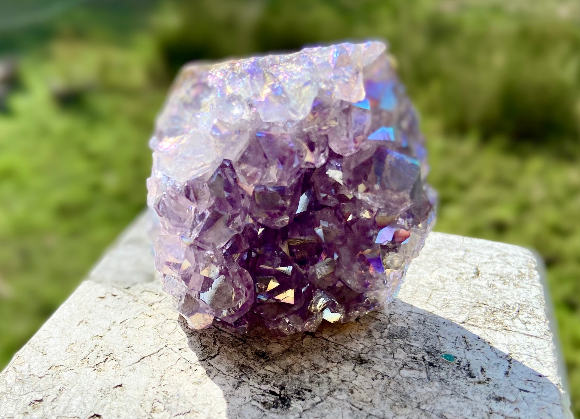 These Pearl Amethyst Angel Aura Quartz Clusters are little pockets of pure celestial magic — each one a radiant fusion of light, joy and transformation. Born from natural Quartz that has been alchemically bonded with fine vapours of platinum, gold and silver at over 1600°F, these clusters shimmer with an ethereal rainbow glow, reminiscent of angel wings in sunlight.