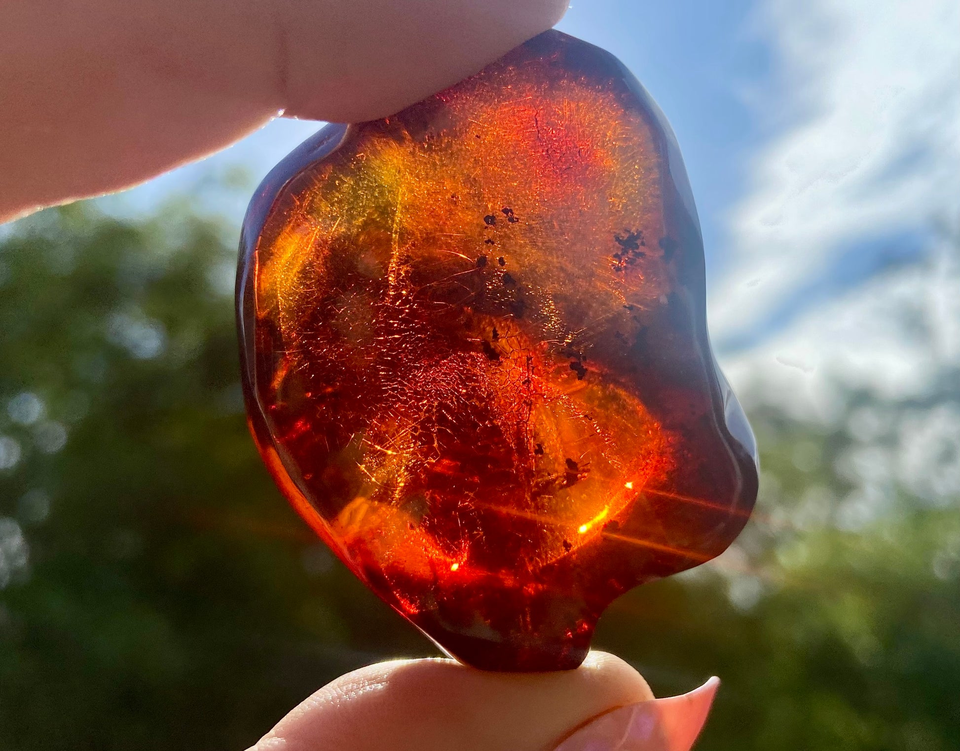 Polished to reveal its glowing inner fire, this specimen carries ancient organic inclusions—plant matter, tiny insects, and fragments of primordial forests—preserved for millions of years within its fiery red resin. It is a living time capsule of Earth’s natural history and solar energy.
