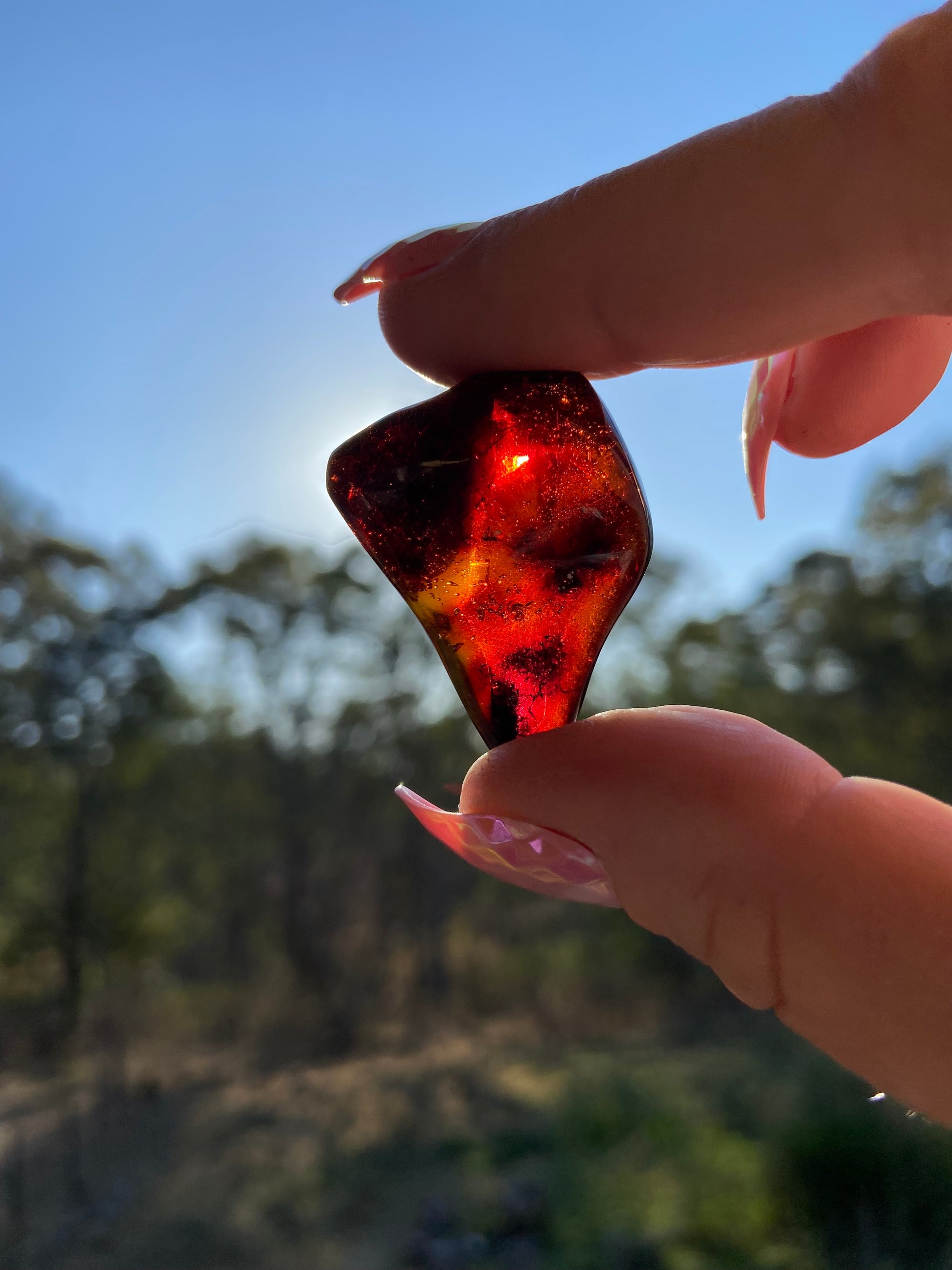Amber is an organic gemstone, not a mineral—formed of fossilized tree resin. Red Fire Amber carries the rarest solar frequency, activating both primal energy and higher creative fire.